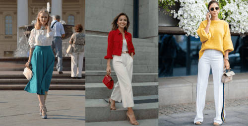 · از لباسهایی با رنگ شاد کنار سفید استفاده کنید؛ مثل شلوار مرجانی یا کیف فیروزهای