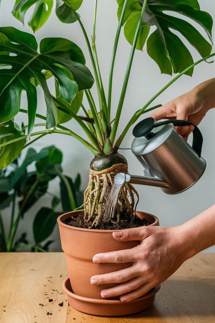 گل برگ انجیری یا پنیر سوئیسی نیاز به آبیاری دقیق و منظم دارد اما نگهداری آن بسیار آسان است؛ بهترین زمان برای آبیاری وقتی است که خاک گلدان تا حد زیادی خشک شده باشد. پس اجازه دهید خاک کاملاً خشک شود و سپس به اندازه کافی آب دهید تا از کف گلدان کمی آب خارج شود. زهکشی مناسب گلدان اهمیت زیادی دارد تا ریشهها از خیسزدگی و پوسیدگی محافظت شوند، زیرا ریشههای خیس دشمن اصلی مونسترا هستند. اگر برگهای گل شما زرد شدند، معمولاً نشانه آبیاری بیش از حد یا کمآبی است؛ در این صورت حتماً برنامه آبیاری را بازنگری کنید تا گل شاداب و سالم باقی بماند. رعایت این نکات، عمر و طراوت برگ انجیری را تضمین میکند.